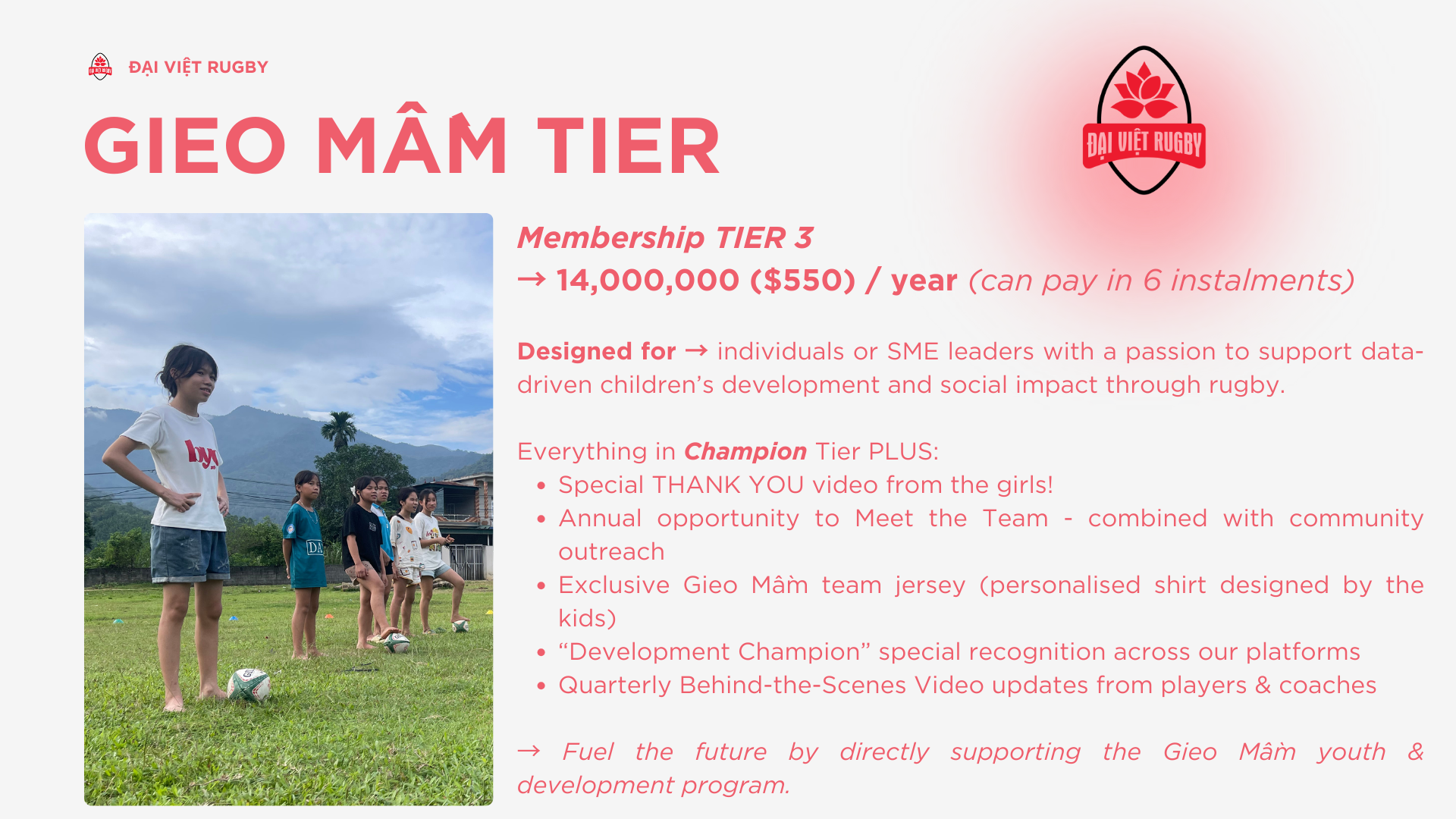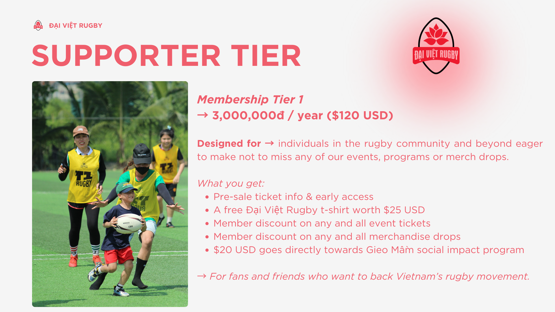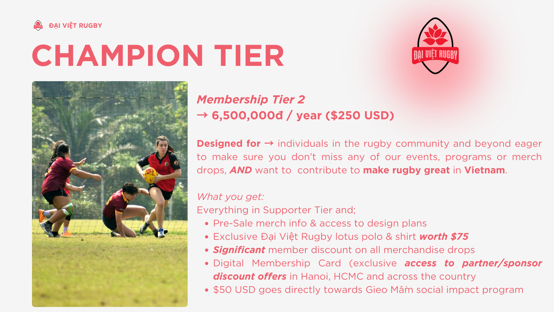 Designed for → individuals in the rugby community and beyond eager to make sure you don’t miss any of our events, programs or merch drops, AND want to contribute to make rugby great in Vietnam.